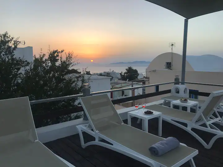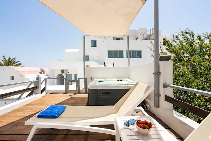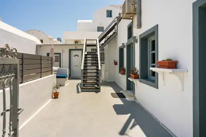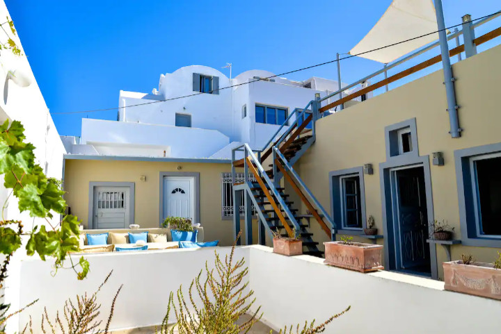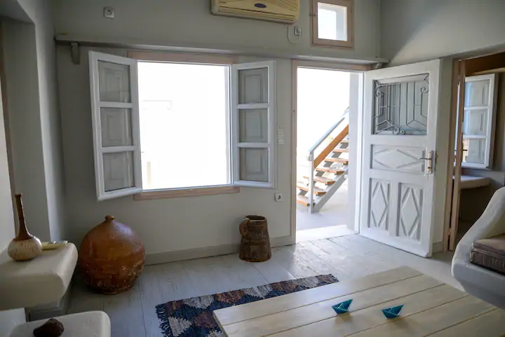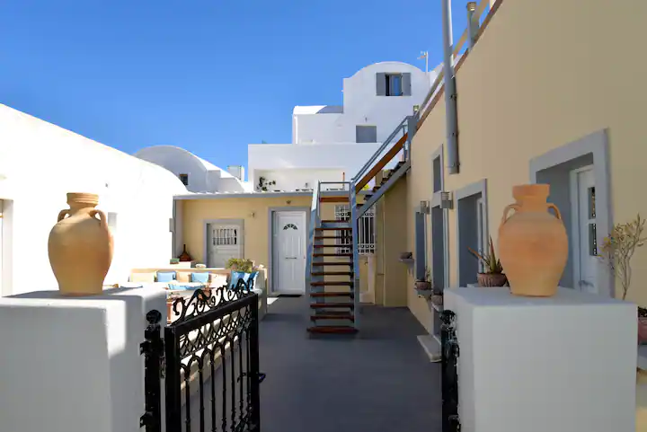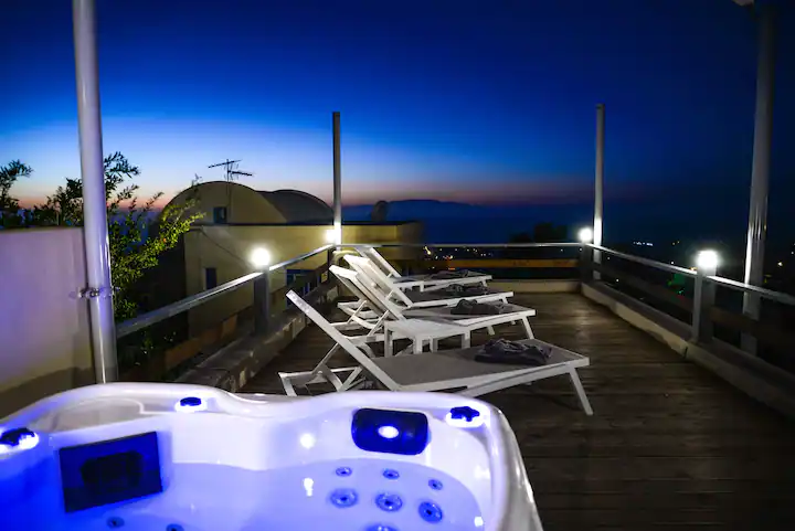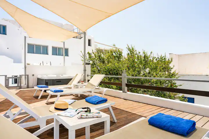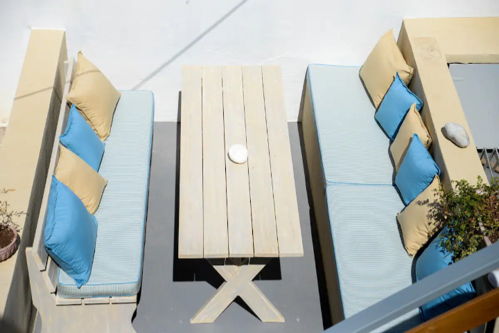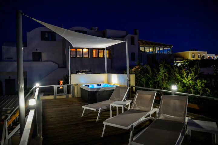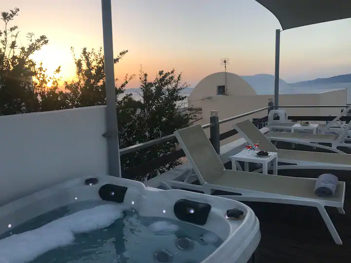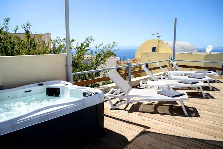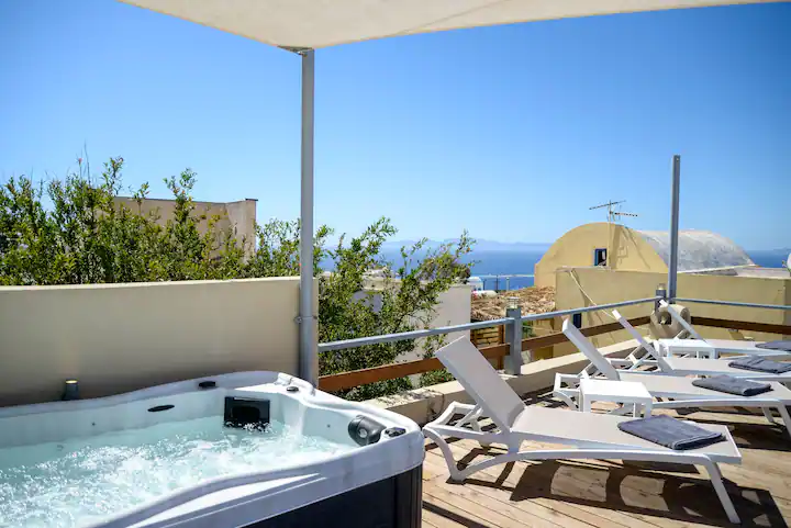 Sunrise is a Cycladic apartment in the center of Oia Village. Only steps from the famous “caldera”, parking on-site and no steps to reach it very bright spaces with a large terrace with a Jacuzzi for stunning views at sunrise and sunset. It is fully equipped with everything you need to enjoy your vacation in Santorini. The outdoor living room has a comfortable shaded table with benches and amazing decor.