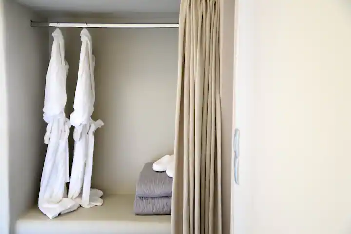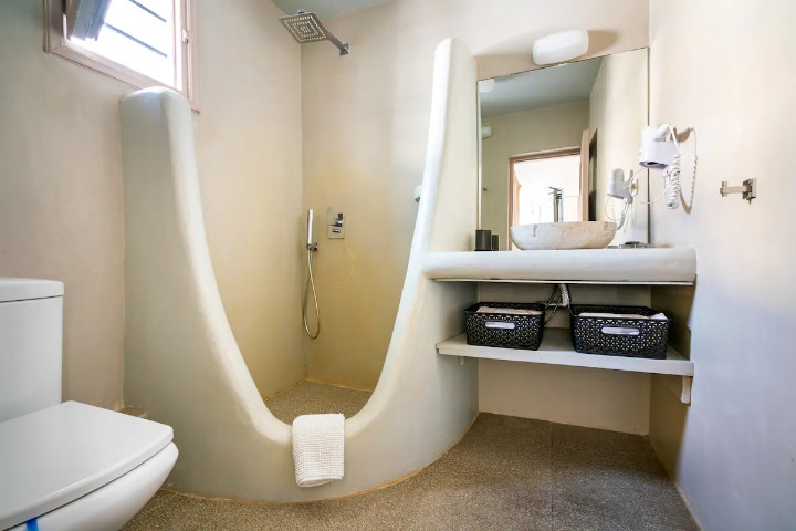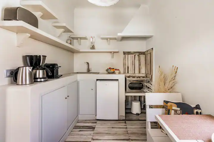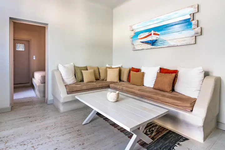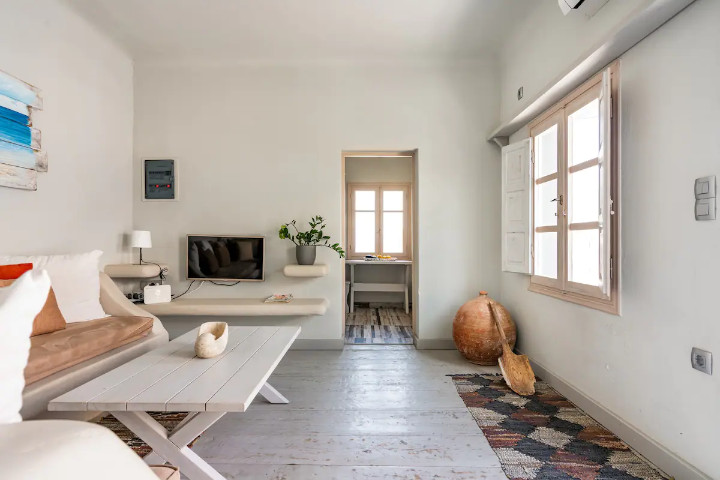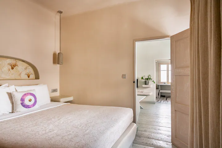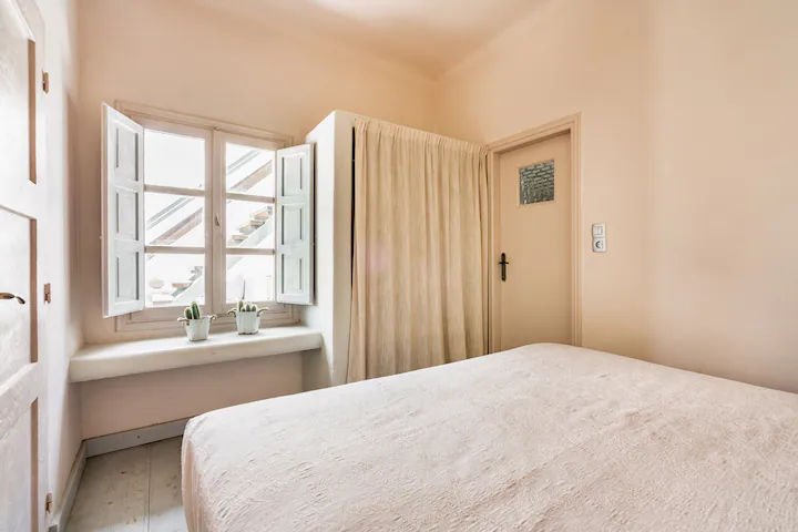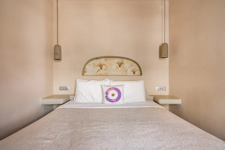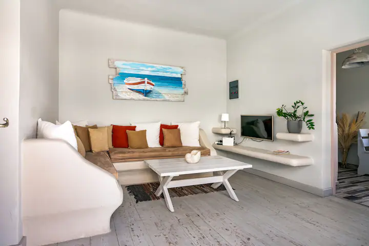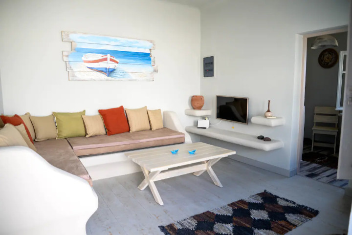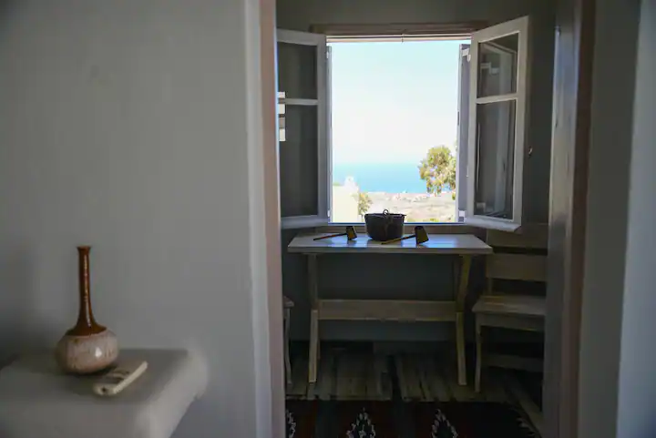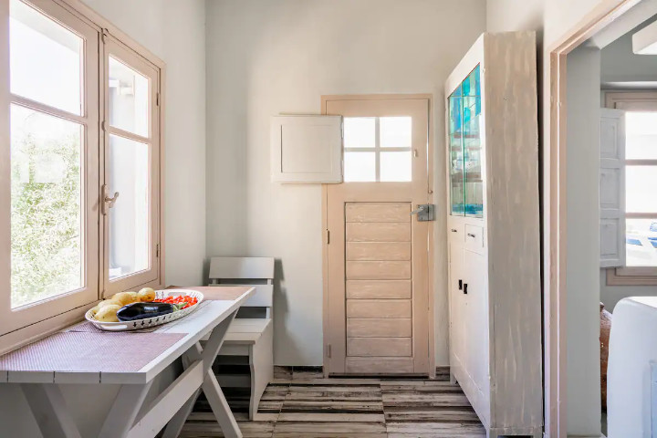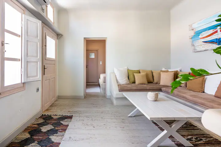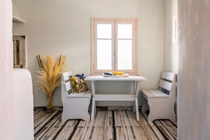 Sunrise is a Cycladic apartment in the center of Oia Village. Only steps from the famous “caldera”, parking on-site and no steps to reach it very bright spaces with a large terrace with a Jacuzzi for stunning views at sunrise and sunset. It is fully equipped with everything you need to enjoy your vacation in Santorini. The outdoor living room has a comfortable shaded table with benches and amazing decor.
