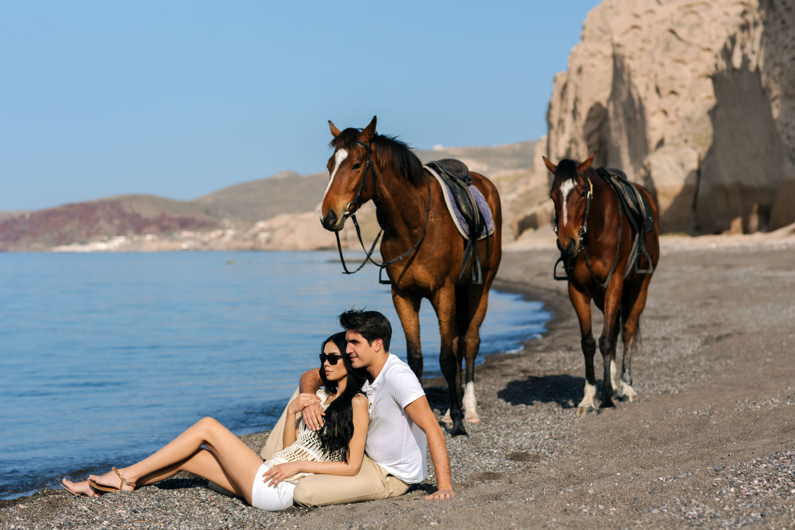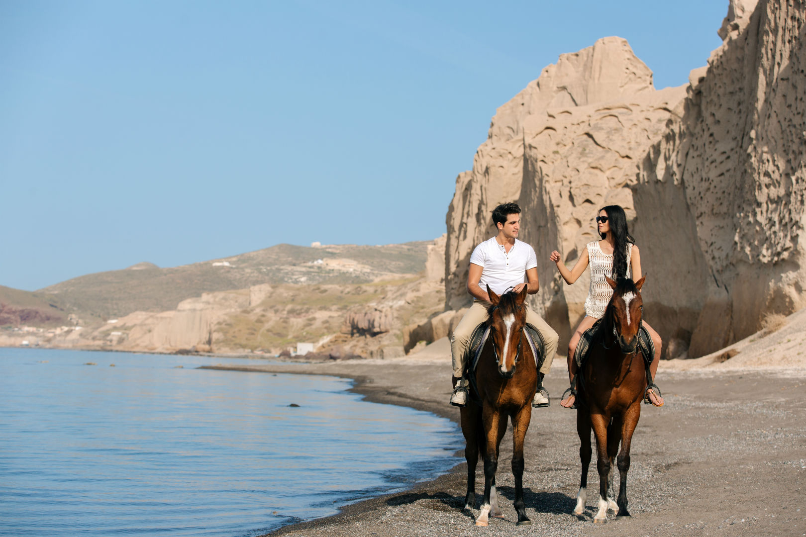 On this tour one of your lifelong dreams will come true: to ride along the beach on a gorgeous horse! The landscape and the blue Aegean waters will amaze you as you walk along the black sand beach and ride back up to the stables. You will admire the power of nature, as these paths were created by the great eruption.