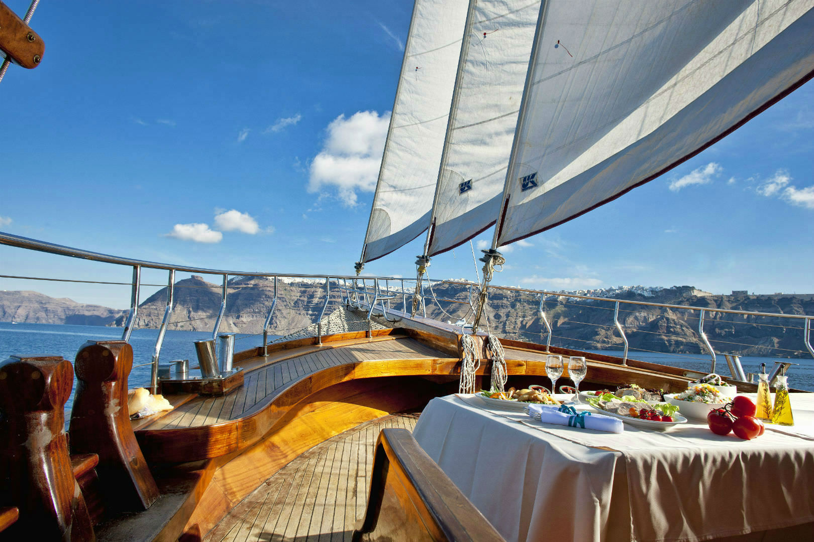 Santorini sunset boat tour Highlights: Visit the Volcano, swim at the Hot springs, enjoy your sunset dinner at Oia.